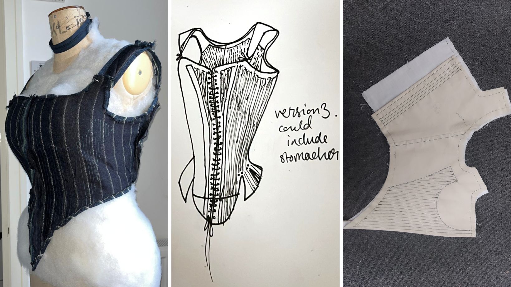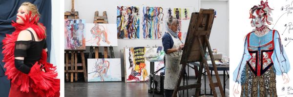 | Image‍s: Eve Stuart modelling her costume at the Seawhite Studio; Krysia Drury painting during a figure painting course led by Katie Sollohub; Eve Stuart costume design. |