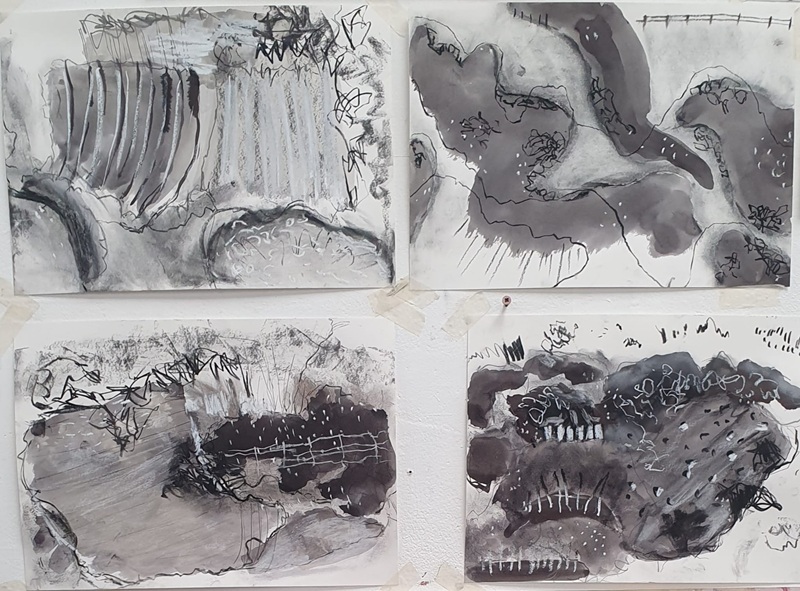 Working outside for most of the day the focus of the first  two days is spending time making experimental drawings which will provide inspiration and reference for paintings later in the week. Â