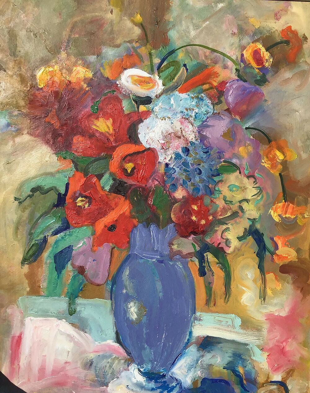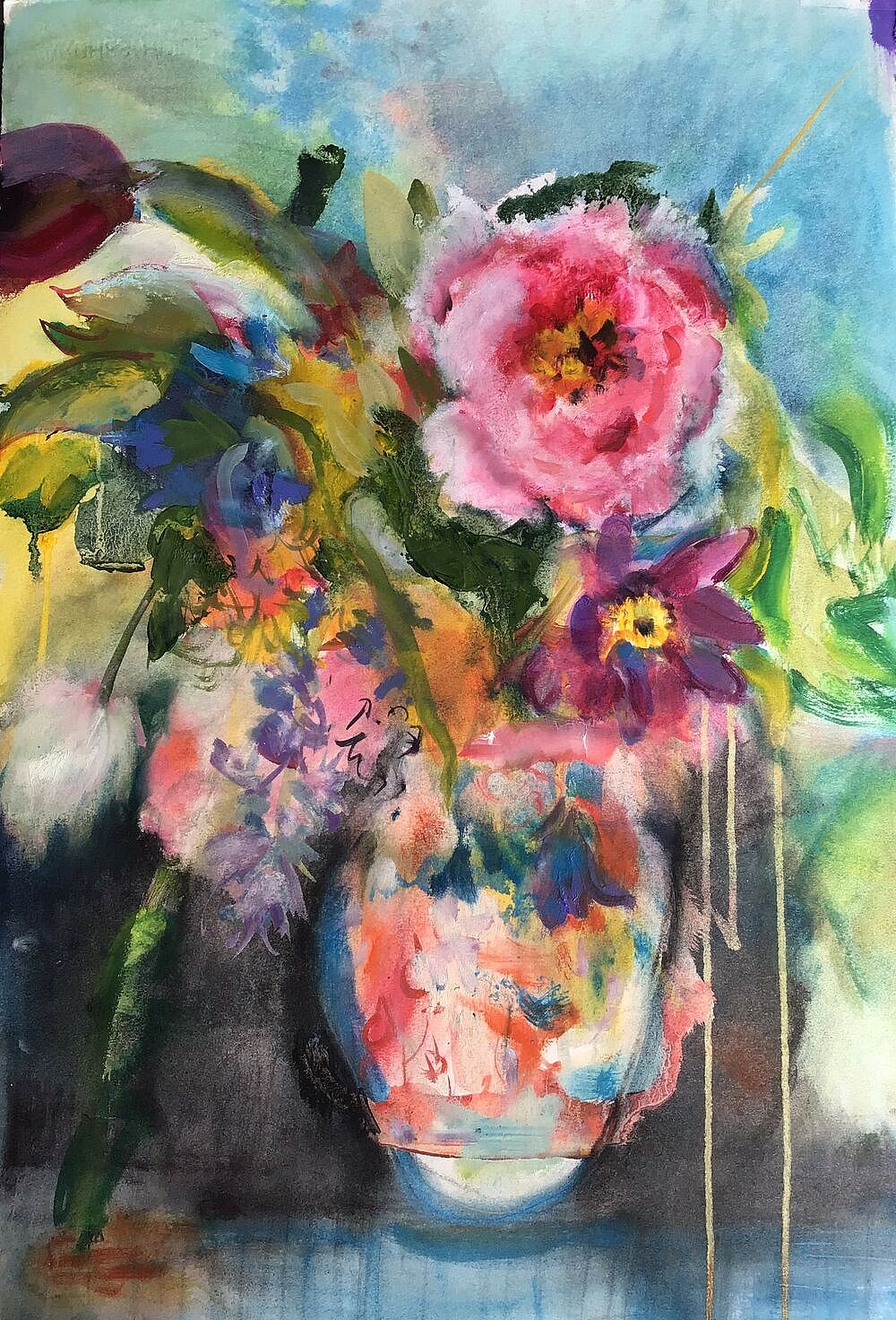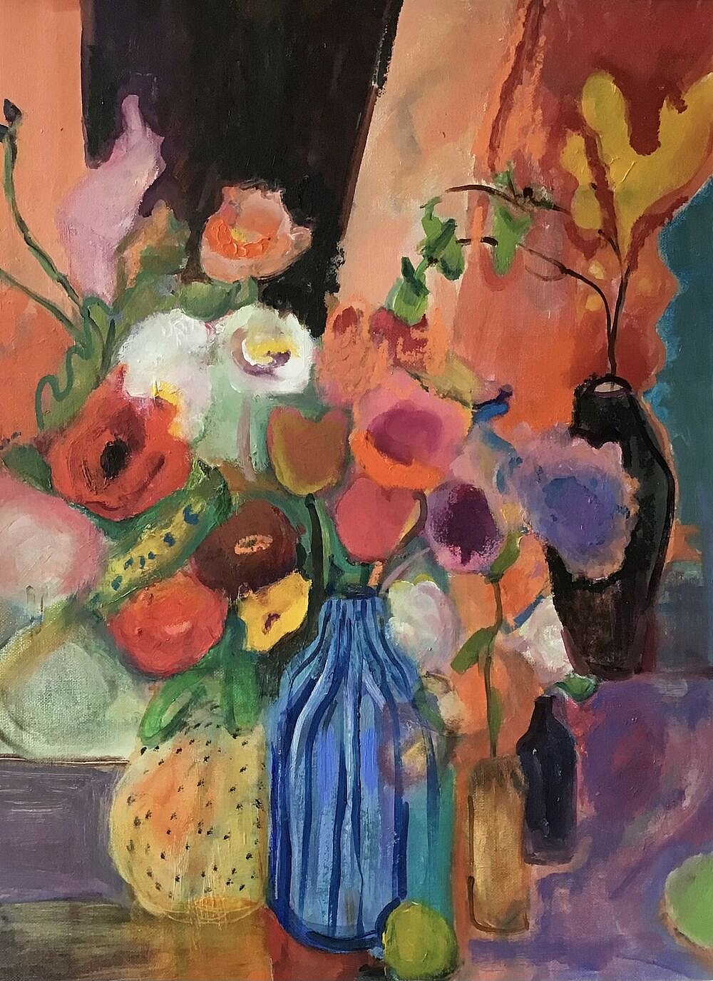 My greenhouse. Exotic flowers falling from the sky as if in a rainforest with humming birds feeding from the trumpets, the vibrant colours and sultry heat encourage the twining, twisting, clinging stems into a tangle of lusciouness fighting for the light and survival. Damp red earth and azure blue skies feed the hot scent.