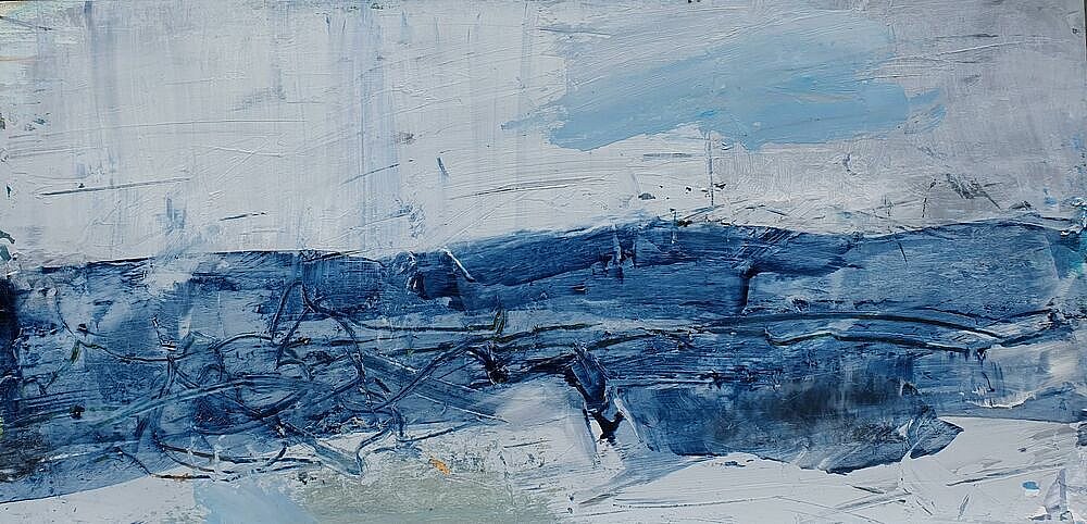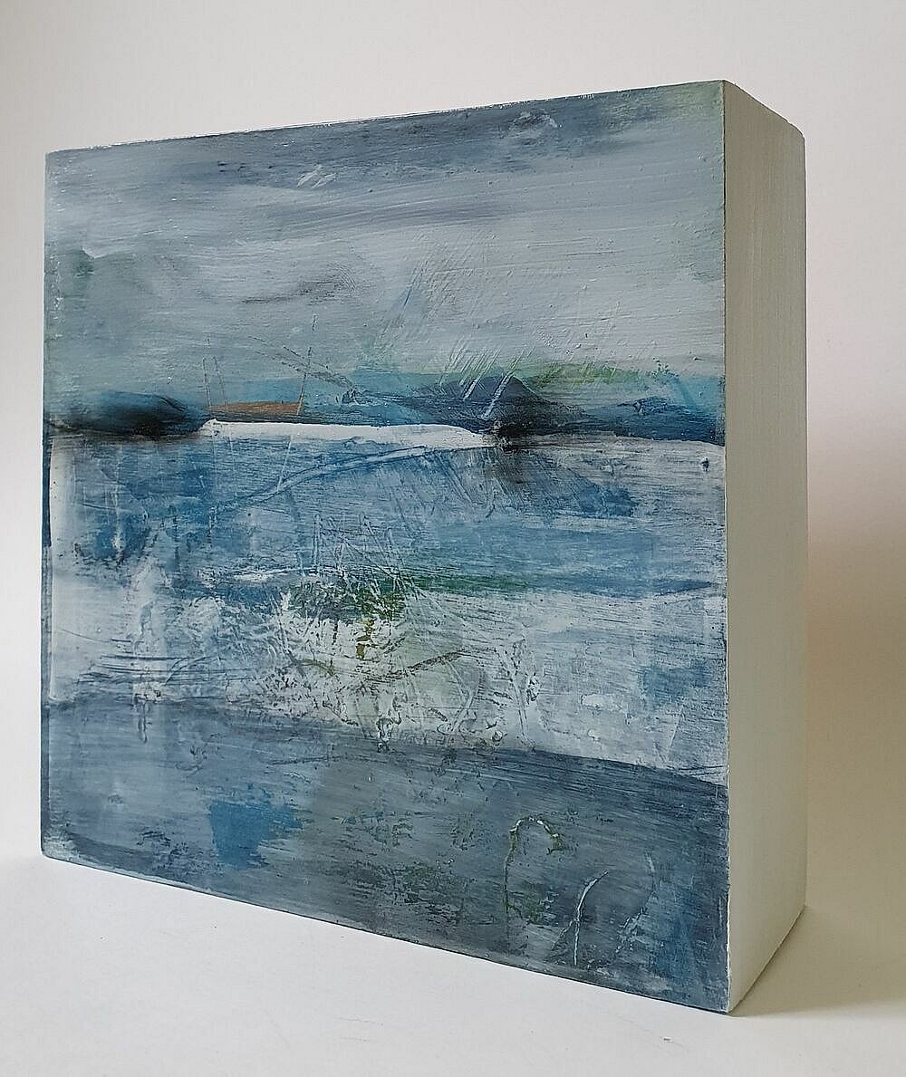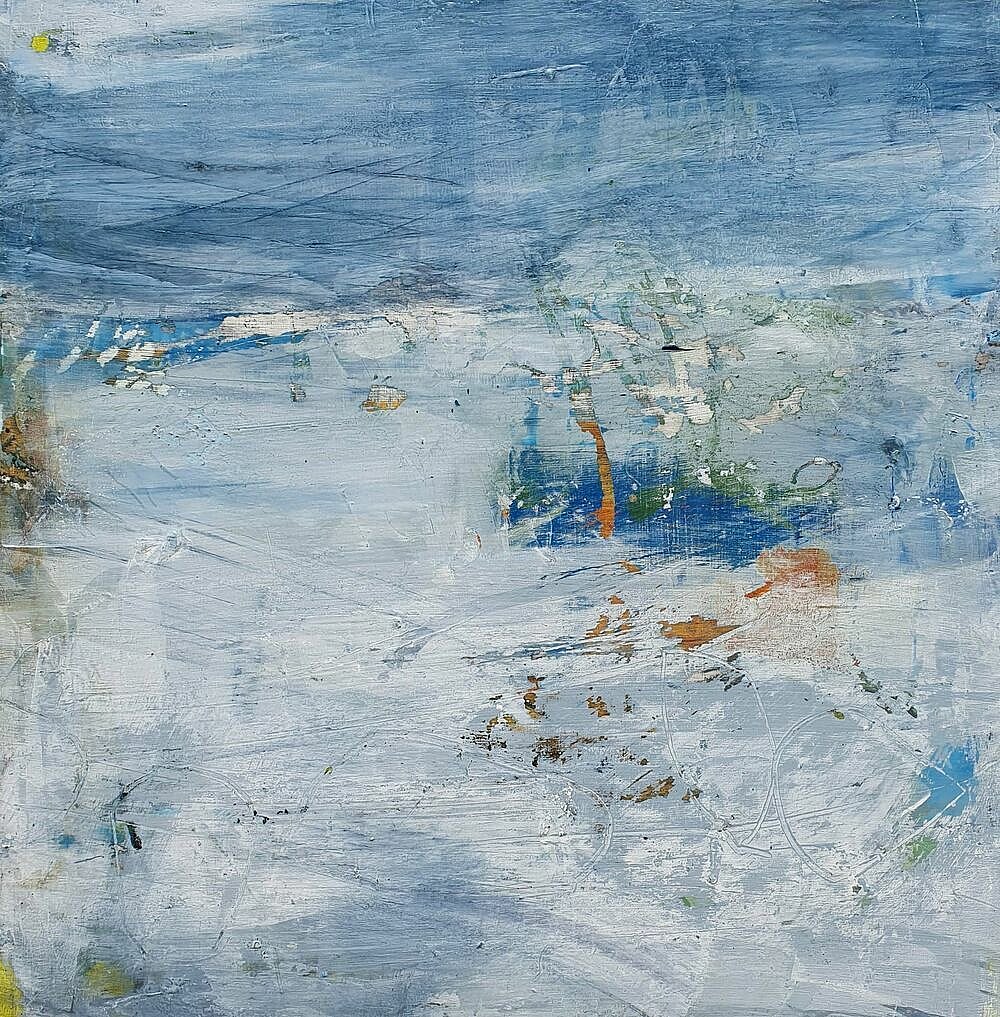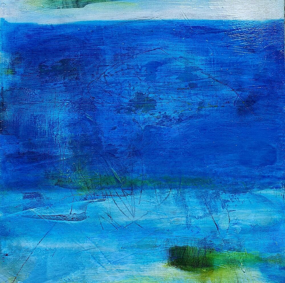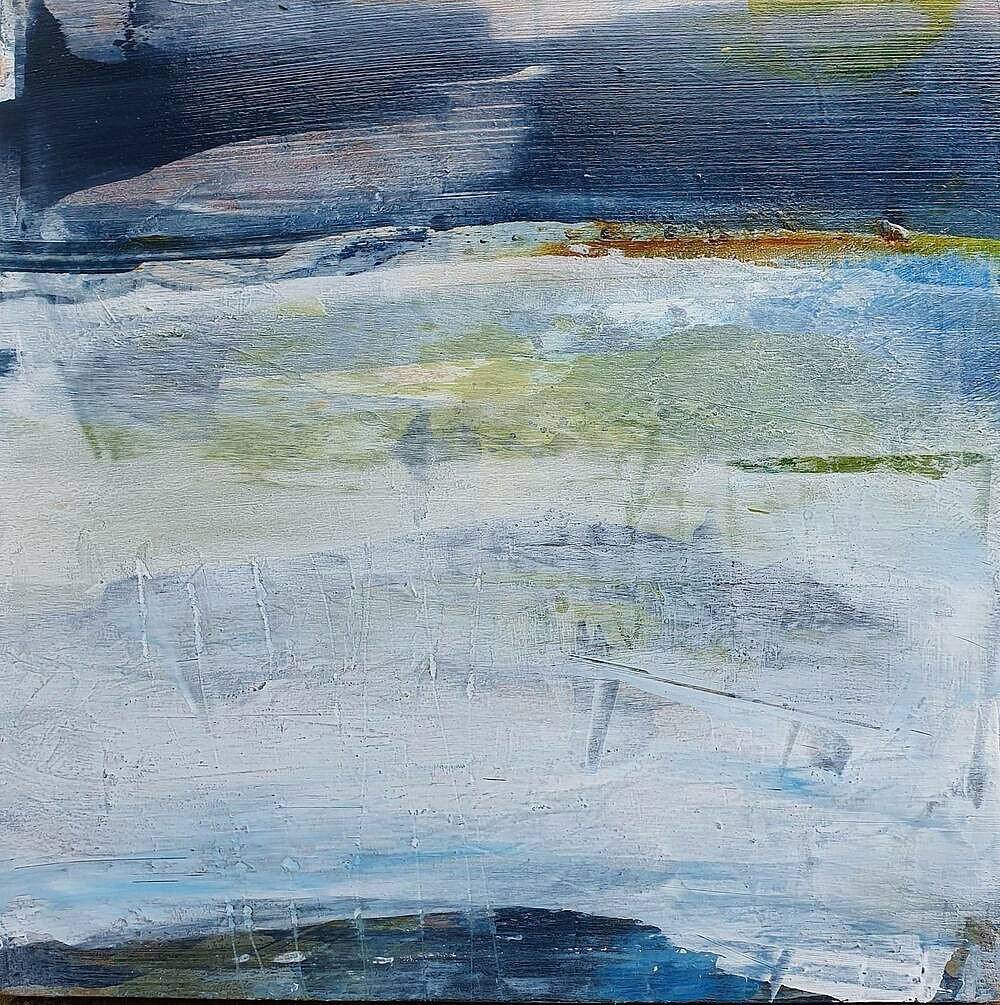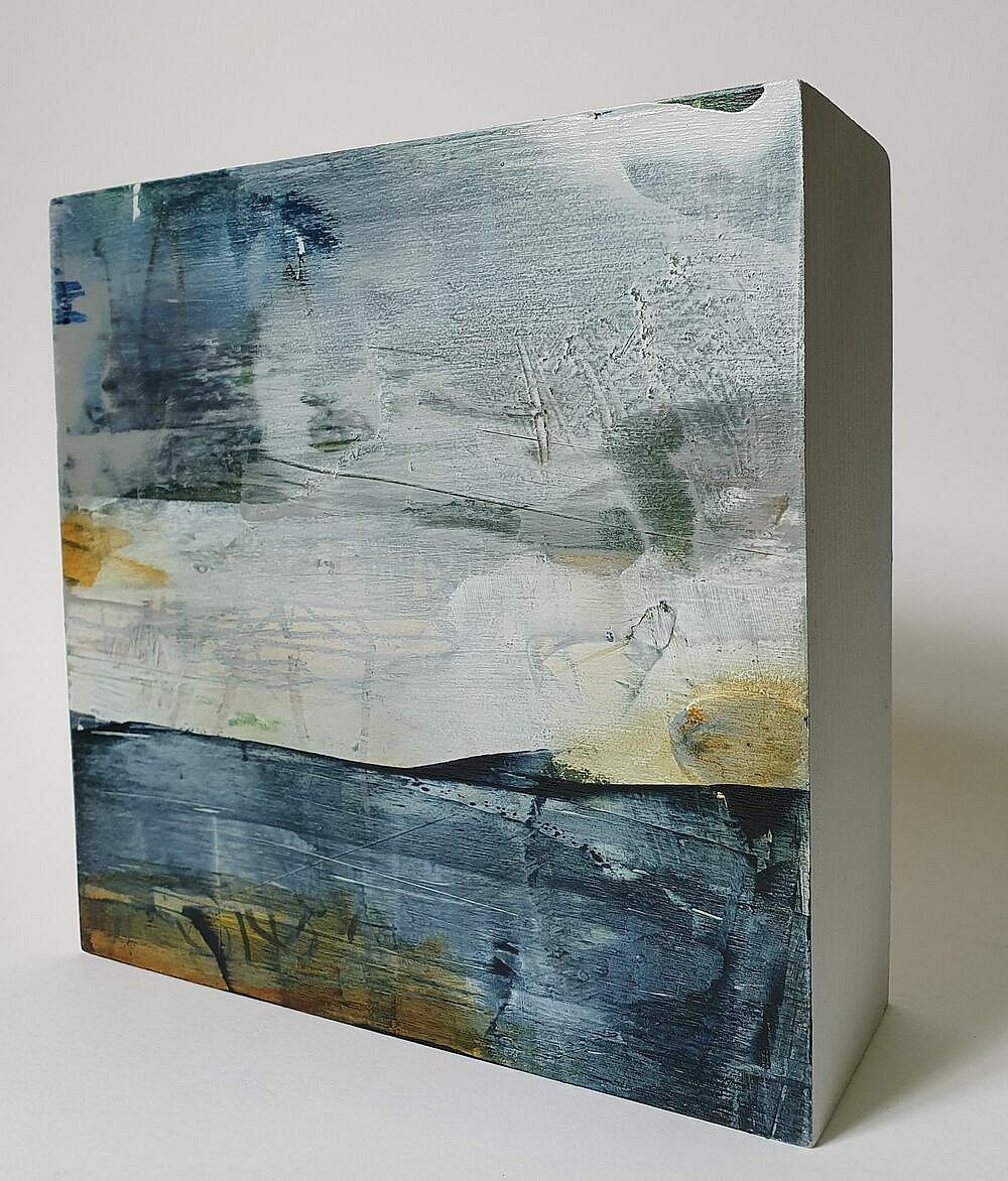 I work in acrylic and mixed media on paper and wood panels, applying layer after layer of medium and then sanding back until the feeling I want to achieve emerges. I am fascinated by how line, shapes and colour can trigger memories and feelings from the past. My work is not about a specific place or view but a combination of areas I have spent time in.