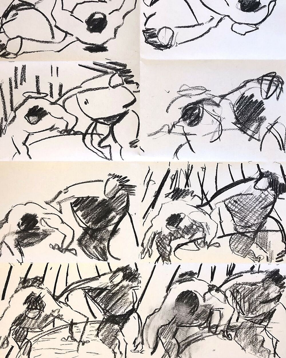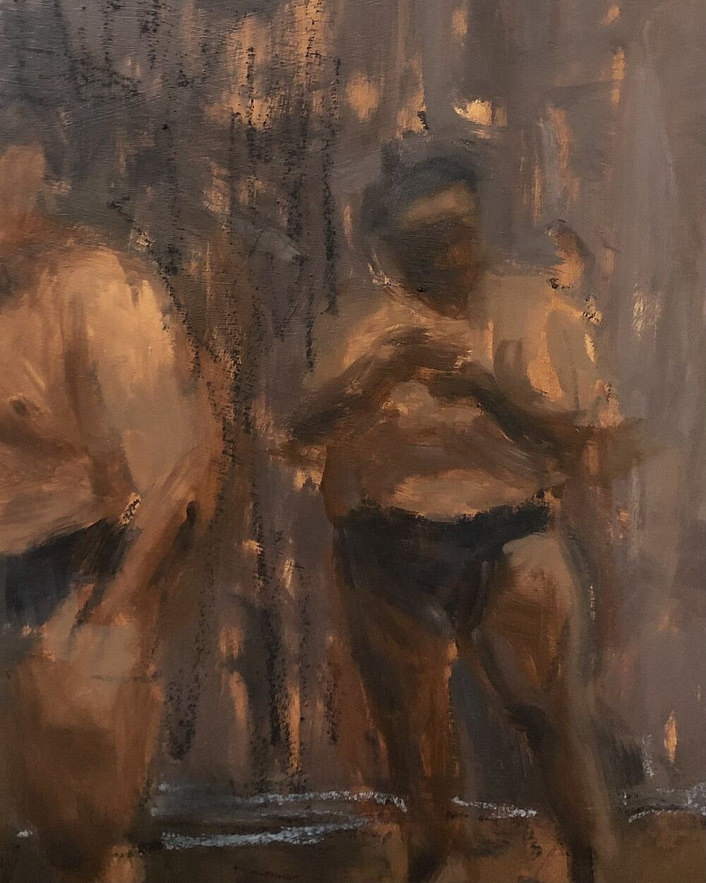 How about the less colourful world of their practice sessions? I am currently in the middle of developing paintings of sumo practice. Whatever excitement I try to convey, it is important to me to do so while providing the viewer with an interesting surface, and I mean it in a literal way. The mark making exercises Emily lead us during Paint Fit have become great tools in this aspect.