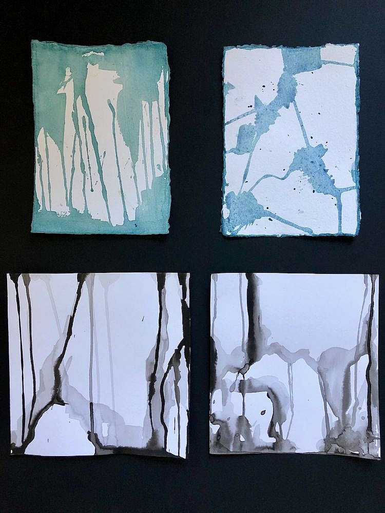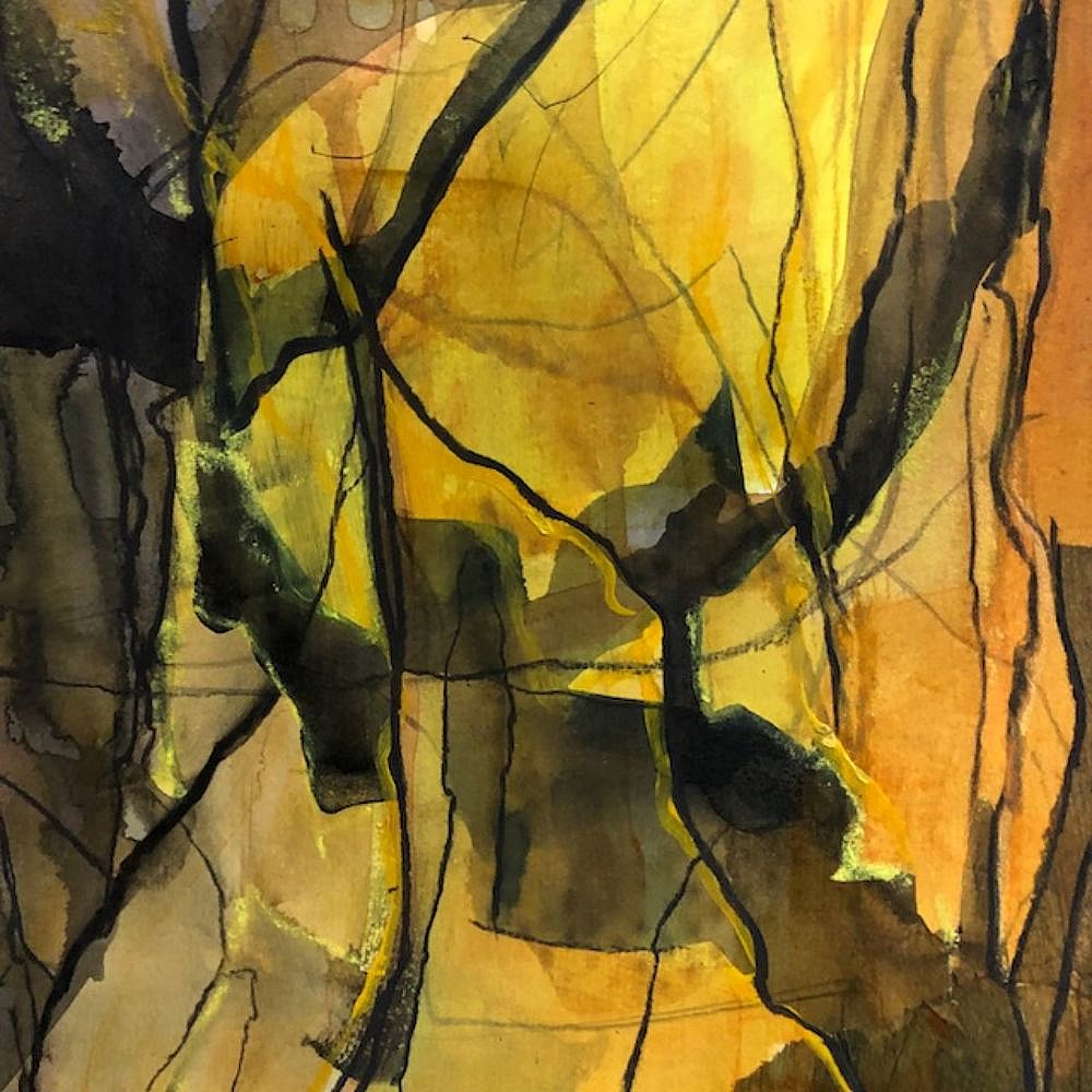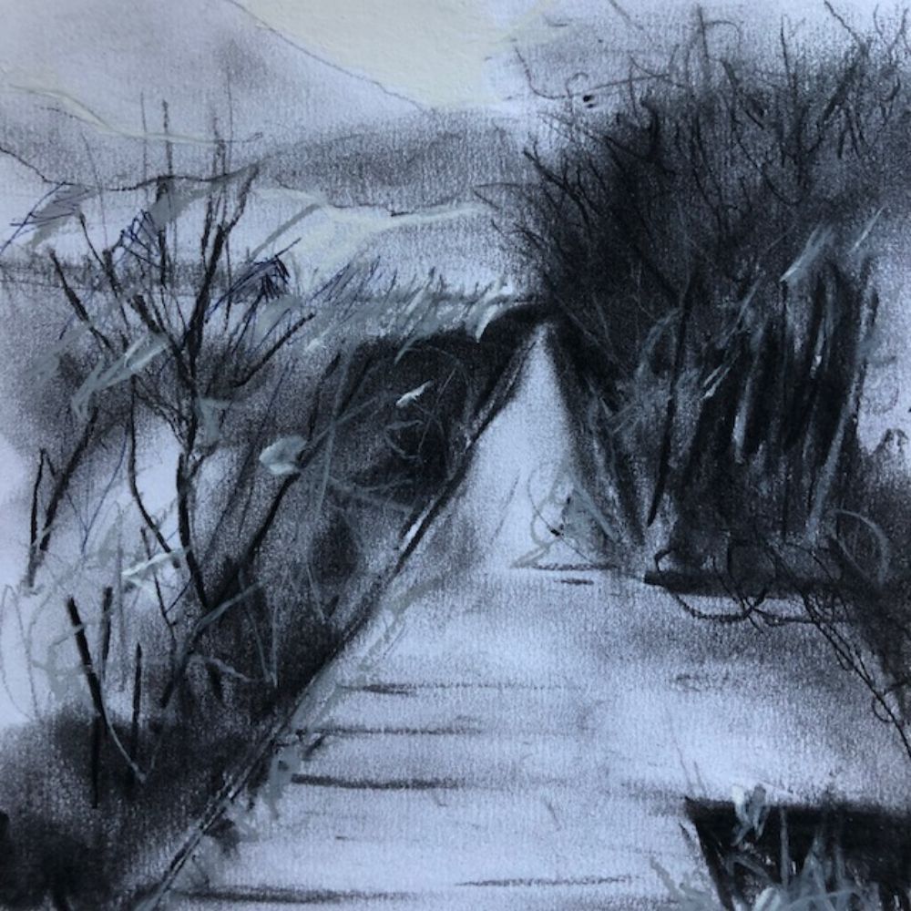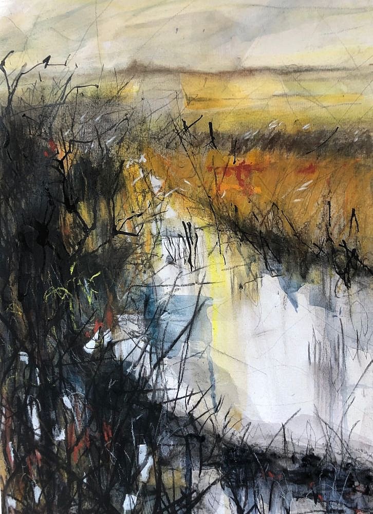 This is still work in progress - drawing on some fascinating local history archive research as well as sketching, photographing and gathering ‘tools’ and materials out in the fens. The physical process of using and inscribing these materials into the work – soaking fen water into paper, mixing it into the paint and running and pooling it across surfaces, scratching and drawing with twigs, stones, stalks and reeds, incorporating collaged elements – seems to help me to understand and get closer to these mysterious and enigmatic places. Although their actual presence may be invisible, somehow embedding these ingredients within the fabric of the work gives it a stronger resonance for me.